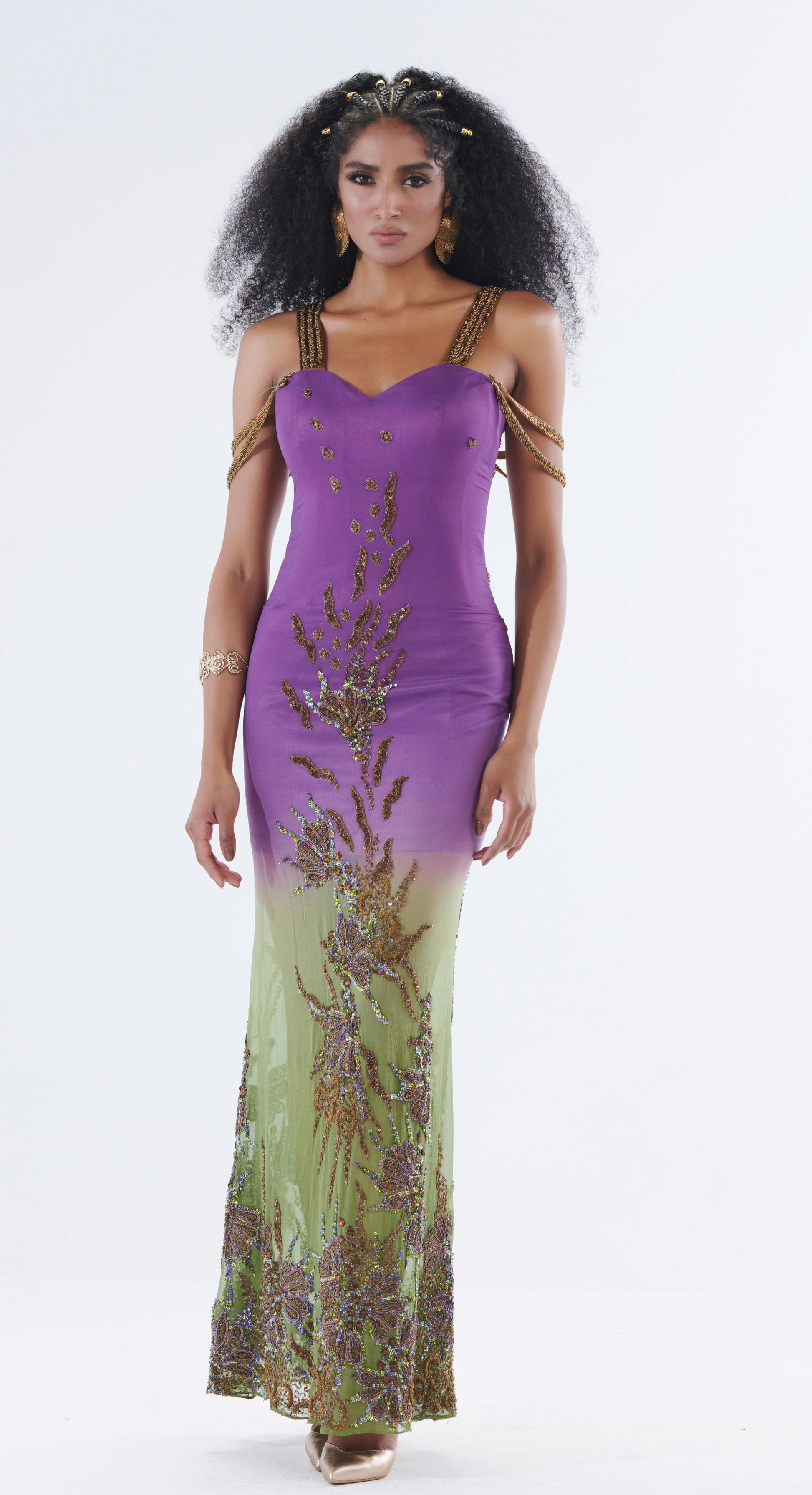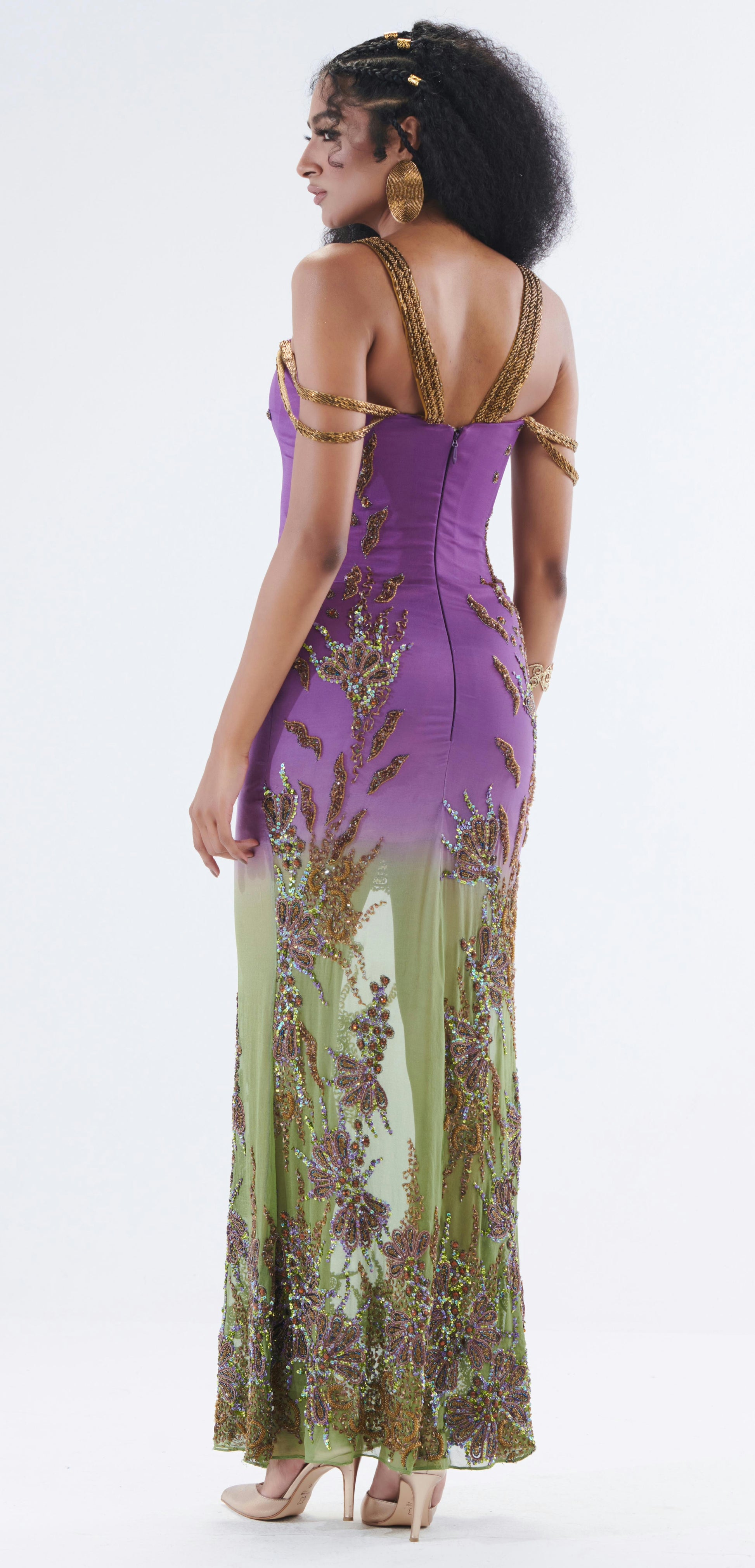 Add a touch of luxury to your wardrobe with Aarna's purple dress. Hand-stitched embroidery and delicate beadwork on the finest silk chiffon georgette fabric elevate this elegant and modern silhouette, perfect for formal events.