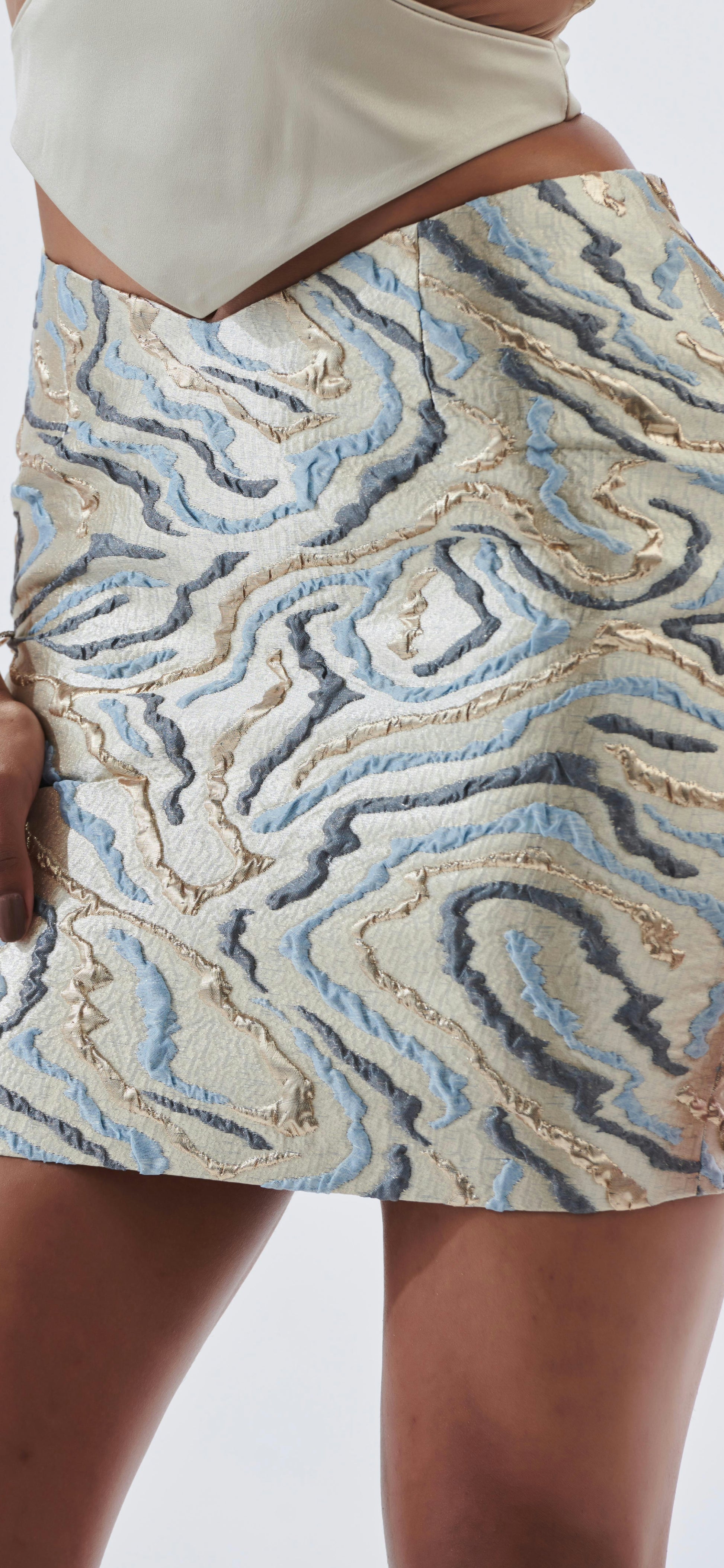 Indulge in luxury with The Lemon Cream Set. This modern, subtle set and features a Brocade Marble effect Skirt and sultry Corset with see-through cut-outs.